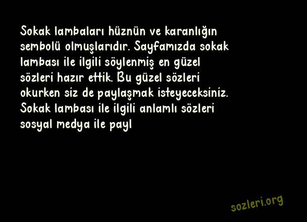 Sokak lambaları hüznün ve karanlığın sembolü olmuşlarıdır. Sayfamızda sokak lambası ile ilgili söylenmiş en güzel sözleri hazır ettik. Bu güzel sözleri okurken siz de paylaşmak isteyeceksiniz. Sokak lambası ile ilgili anlamlı sözleri sosyal medya ile payl ( Sokak Lambası )