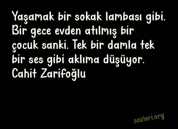 Yaşamak bir sokak lambası gibi. Bir gece evden atılmış bir çocuk sanki. Tek bir damla tek bir ses gibi aklıma düşüyor. Cahit Zarifoğlu ( Sokak Lambası )