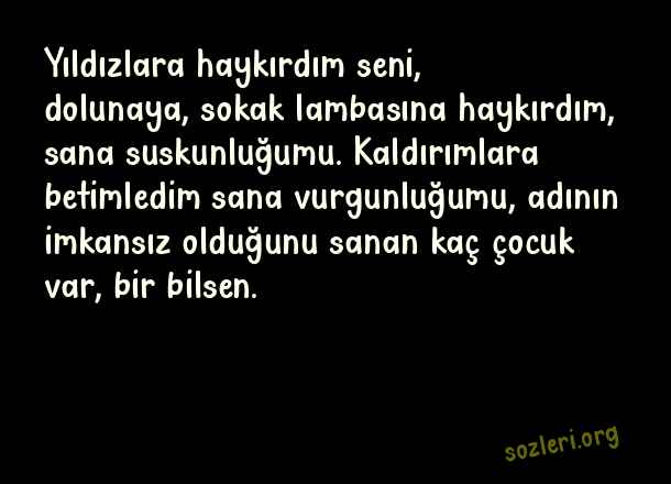Yıldızlara haykırdım seni, dolunaya, sokak lambasına haykırdım, sana suskunluğumu. Kaldırımlara betimledim sana vurgunluğumu, adının imkansız olduğunu sanan kaç çocuk var, bir bilsen. ( Sokak Lambası )