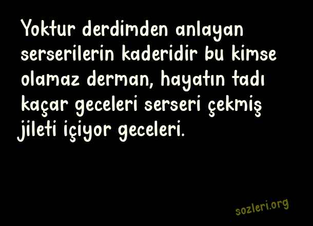 Yoktur derdimden anlayan serserilerin kaderidir bu kimse olamaz derman, hayatın tadı kaçar geceleri serseri çekmiş jileti içiyor geceleri. ( Sokak )