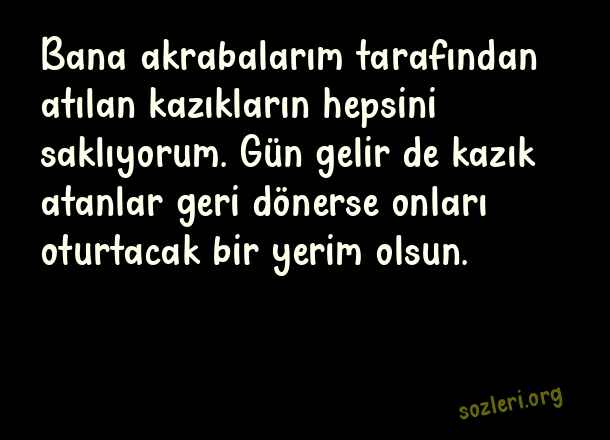 Bana akrabalarım tarafından atılan kazıkların hepsini saklıyorum. Gün gelir de kazık atanlar geri dönerse onları oturtacak bir yerim olsun. ( Akrabaya Laf Sokucu Sözler )