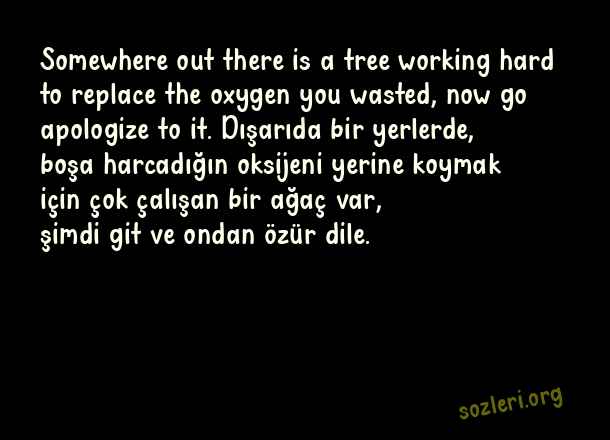 Somewhere out there is a tree working hard to replace the oxygen you wasted, now go apologize to it. Dışarıda bir yerlerde, boşa harcadığın oksijeni yerine koymak için çok çalışan bir ağaç var, şimdi git ve ondan özür dile. ( İngilizce Laf Sokucu Sözler )