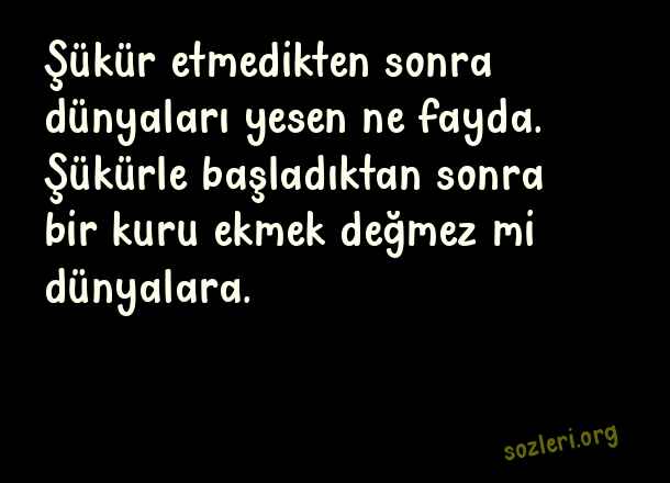 Şükür etmedikten sonra dünyaları yesen ne fayda. Şükürle başladıktan sonra bir kuru ekmek değmez mi dünyalara. ( Şükür )