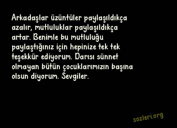 Arkadaşlar üzüntüler paylaşıldıkça azalır, mutluluklar paylaşıldıkça artar. Benimle bu mutluluğu paylaştığınız için hepinize tek tek teşekkür ediyorum. Darısı sünnet olmayan bütün çocuklarımızın başına olsun diyorum. Sevgiler. ( Sünnet Kutlama )