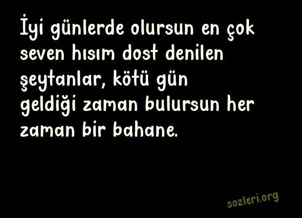 İyi günlerde olursun en çok seven hısım dost denilen şeytanlar, kötü gün geldiği zaman bulursun her zaman bir bahane. ( Susturucu Anlamlı Kapak Sözler )