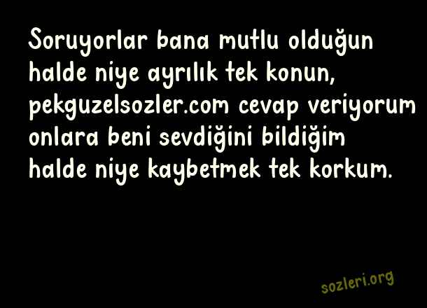 Soruyorlar bana mutlu olduğun halde niye ayrılık tek konun, cevap veriyorum onlara beni sevdiğini bildiğim halde niye kaybetmek tek korkum. ( Susturucu Anlamlı Kapak Sözler )