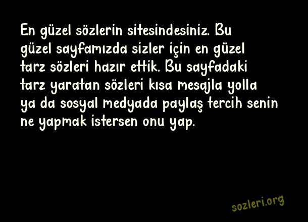 En güzel sözlerin sitesindesiniz. Bu güzel sayfamızda sizler için en güzel tarz sözleri hazır ettik. Bu sayfadaki tarz yaratan sözleri kısa mesajla yolla ya da sosyal medyada paylaş tercih senin ne yapmak istersen onu yap. ( Tarz Sözler )