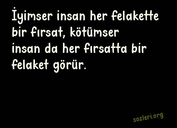 İyimser insan her felakette bir fırsat, kötümser insan da her fırsatta bir felaket görür. ( Tarz Sözler )