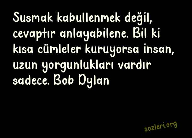 Susmak kabullenmek değil, cevaptır anlayabilene. Bil ki kısa cümleler kuruyorsa insan, uzun yorgunlukları vardır sadece. Bob Dylan ( Tarz Sözler )