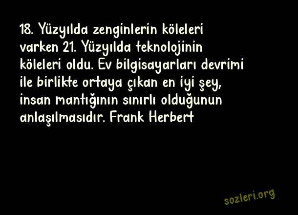 18. Yüzyılda zenginlerin köleleri varken 21. Yüzyılda teknolojinin köleleri oldu. Ev bilgisayarları devrimi ile birlikte ortaya çıkan en iyi şey, insan mantığının sınırlı olduğunun anlaşılmasıdır. Frank Herbert ( Teknoloji )