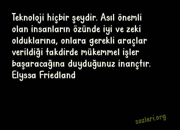 Teknoloji hiçbir şeydir. Asıl önemli olan insanların özünde iyi ve zeki olduklarına, onlara gerekli araçlar verildiği takdirde mükemmel işler başaracağına duyduğunuz inançtır. Elyssa Friedland ( Teknoloji )