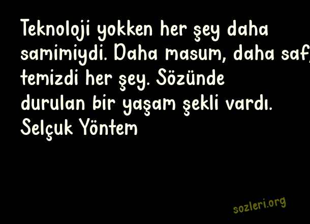 Teknoloji yokken her şey daha samimiydi. Daha masum, daha saf, temizdi her şey. Sözünde durulan bir yaşam şekli vardı. Selçuk Yöntem ( Teknoloji )
