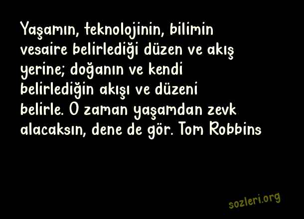 Yaşamın, teknolojinin, bilimin vesaire belirlediği düzen ve akış yerine; doğanın ve kendi belirlediğin akışı ve düzeni belirle. O zaman yaşamdan zevk alacaksın, dene de gör. Tom Robbins ( Teknoloji )