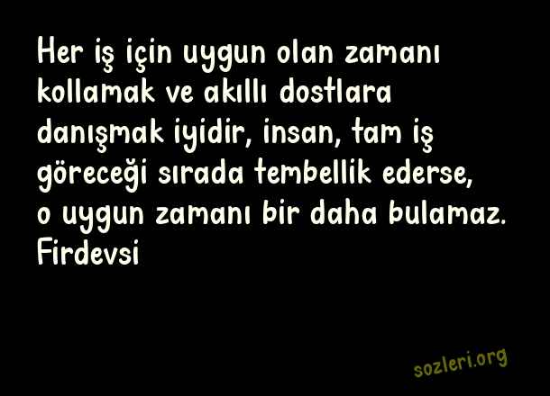 Her iş için uygun olan zamanı kollamak ve akıllı dostlara danışmak iyidir, insan, tam iş göreceği sırada tembellik ederse, o uygun zamanı bir daha bulamaz. Firdevsi ( Tembellik )