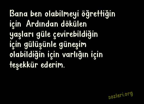 Bana ben olabilmeyi öğrettiğin için… Ardından dökülen yaşları güle çevirebildiğin için gülüşünle güneşim olabildiğin için varlığın için teşekkür ederim. ( Teşekkür )