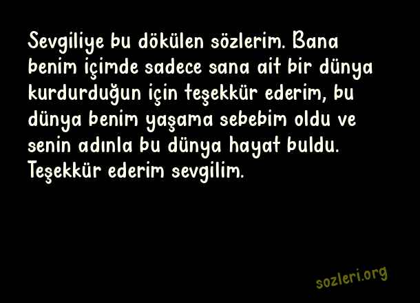 Sevgiliye bu dökülen sözlerim. Bana benim içimde sadece sana ait bir dünya kurdurduğun için teşekkür ederim, bu dünya benim yaşama sebebim oldu ve senin adınla bu dünya hayat buldu. Teşekkür ederim sevgilim. ( Teşekkür )