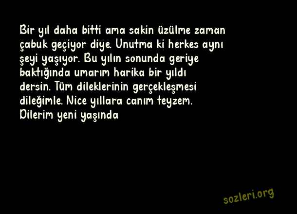 Bir yıl daha bitti ama sakin üzülme zaman çabuk geçiyor diye. Unutma ki herkes aynı şeyi yaşıyor. Bu yılın sonunda geriye baktığında umarım harika bir yıldı dersin. Tüm dileklerinin gerçekleşmesi dileğimle. Nice yıllara canım teyzem. Dilerim yeni yaşında ( Teyzeme Doğum Günü )