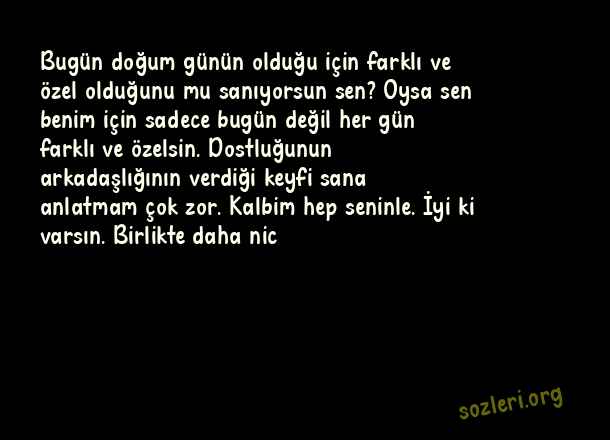 Bugün doğum günün olduğu için farklı ve özel olduğunu mu sanıyorsun sen? Oysa sen benim için sadece bugün değil her gün farklı ve özelsin. Dostluğunun arkadaşlığının verdiği keyfi sana anlatmam çok zor. Kalbim hep seninle. İyi ki varsın. Birlikte daha nic ( Teyzeme Doğum Günü )