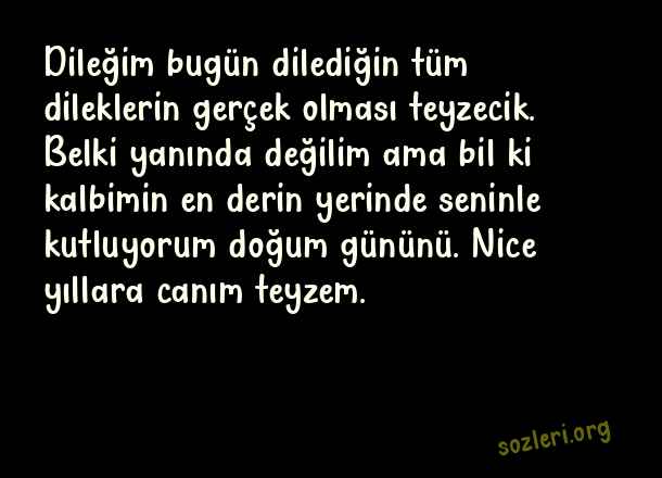 Dileğim bugün dilediğin tüm dileklerin gerçek olması teyzecik. Belki yanında değilim ama bil ki kalbimin en derin yerinde seninle kutluyorum doğum gününü. Nice yıllara canım teyzem. ( Teyzeme Doğum Günü )