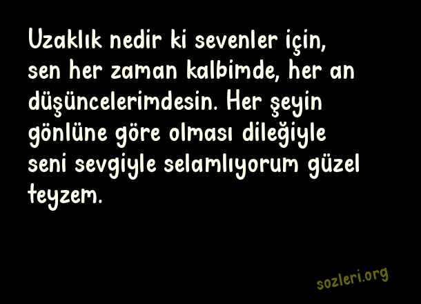 Uzaklık nedir ki sevenler için, sen her zaman kalbimde, her an düşüncelerimdesin. Her şeyin gönlüne göre olması dileğiyle seni sevgiyle selamlıyorum güzel teyzem. ( Teyze )
