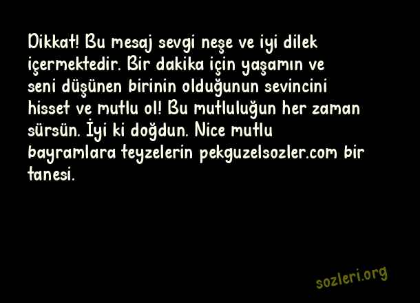 Dikkat! Bu mesaj sevgi neşe ve iyi dilek içermektedir. Bir dakika için yaşamın ve seni düşünen birinin olduğunun sevincini hisset ve mutlu ol! Bu mutluluğun her zaman sürsün. İyi ki doğdun. Nice mutlu bayramlara teyzelerin bir tanesi. ( Teyzeye Bayram )