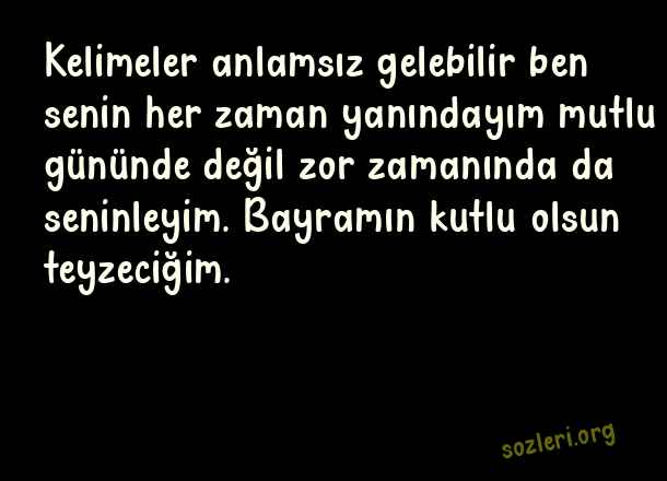 Kelimeler anlamsız gelebilir ben senin her zaman yanındayım mutlu gününde değil zor zamanında da seninleyim. Bayramın kutlu olsun teyzeciğim. ( Teyzeye Bayram )
