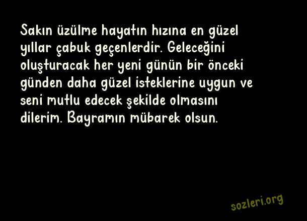 Sakın üzülme hayatın hızına en güzel yıllar çabuk geçenlerdir. Geleceğini oluşturacak her yeni günün bir önceki günden daha güzel isteklerine uygun ve seni mutlu edecek şekilde olmasını dilerim. Bayramın mübarek olsun. ( Teyzeye Bayram )