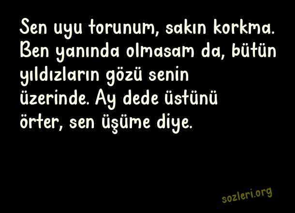 Sen uyu torunum, sakın korkma. Ben yanında olmasam da, bütün yıldızların gözü senin üzerinde. Ay dede üstünü örter, sen üşüme diye. ( Torun Sevgisi )