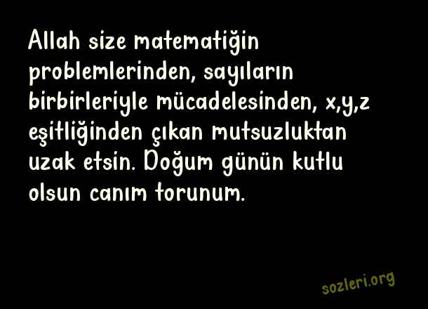 Allah size matematiğin problemlerinden, sayıların birbirleriyle mücadelesinden, x,y,z eşitliğinden çıkan mutsuzluktan uzak etsin. Doğum günün kutlu olsun canım torunum. ( Toruna Doğum Günü )