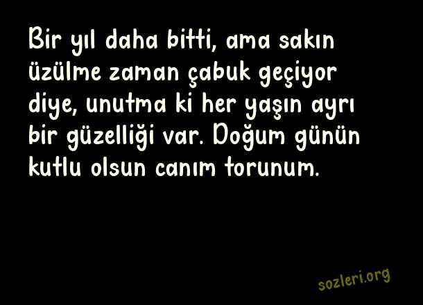 Bir yıl daha bitti, ama sakın üzülme zaman çabuk geçiyor diye, unutma ki her yaşın ayrı bir güzelliği var. Doğum günün kutlu olsun canım torunum. ( Toruna Doğum Günü )