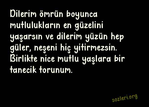 Dilerim ömrün boyunca mutlulukların en güzelini yaşarsın ve dilerim yüzün hep güler, neşeni hiç yitirmezsin. Birlikte nice mutlu yaşlara bir tanecik torunum. ( Toruna Doğum Günü )