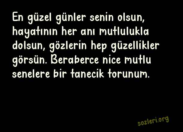 En güzel günler senin olsun, hayatının her anı mutlulukla dolsun, gözlerin hep güzellikler görsün. Beraberce nice mutlu senelere bir tanecik torunum. ( Toruna Doğum Günü )