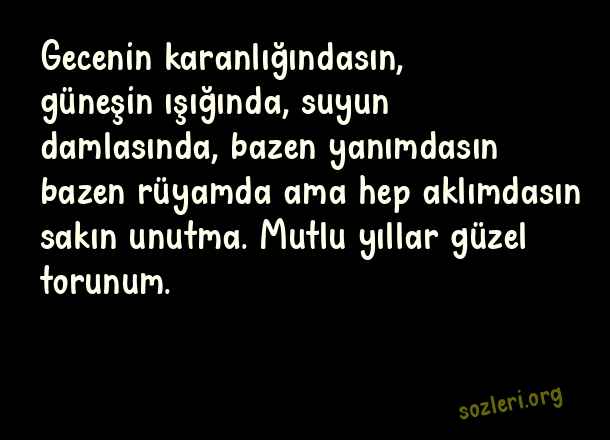 Gecenin karanlığındasın, güneşin ışığında, suyun damlasında, bazen yanımdasın bazen rüyamda ama hep aklımdasın sakın unutma. Mutlu yıllar güzel torunum. ( Toruna Doğum Günü )