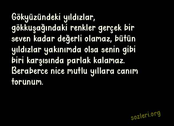 Gökyüzündeki yıldızlar, gökkuşağındaki renkler gerçek bir seven kadar değerli olamaz, bütün yıldızlar yakınımda olsa senin gibi biri karşısında parlak kalamaz. Beraberce nice mutlu yıllara canım torunum. ( Toruna Doğum Günü )