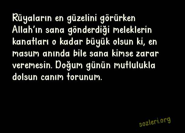 Rüyaların en güzelini görürken Allah’ın sana gönderdiği meleklerin kanatları o kadar büyük olsun ki, en masum anında bile sana kimse zarar veremesin. Doğum günün mutlulukla dolsun canım torunum. ( Toruna Doğum Günü )