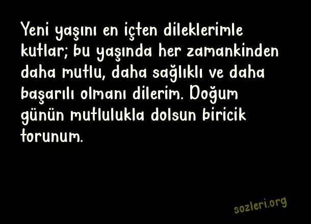 Yeni yaşını en içten dileklerimle kutlar; bu yaşında her zamankinden daha mutlu, daha sağlıklı ve daha başarılı olmanı dilerim. Doğum günün mutlulukla dolsun biricik torunum. ( Toruna Doğum Günü )