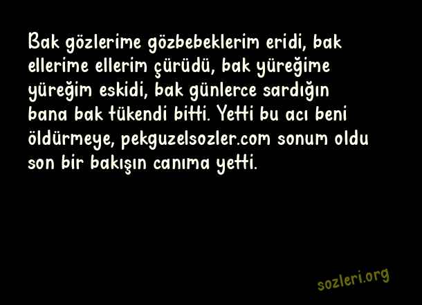 Bak gözlerime gözbebeklerim eridi, bak ellerime ellerim çürüdü, bak yüreğime yüreğim eskidi, bak günlerce sardığın bana bak tükendi bitti. Yetti bu acı beni öldürmeye, sonum oldu son bir bakışın canıma yetti. ( Tükenmek )