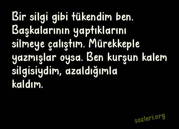 Bir silgi gibi tükendim ben. Başkalarının yaptıklarını silmeye çalıştım. Mürekkeple yazmışlar oysa. Ben kurşun kalem silgisiydim, azaldığımla kaldım. ( Tükenmek )