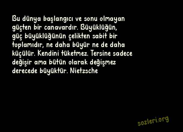 Bu dünya başlangıcı ve sonu olmayan güçten bir canavardır. Büyüklüğün, güç büyüklüğünün çelikten sabit bir toplamıdır, ne daha büyür ne de daha küçülür. Kendini tüketmez. Tersine sadece değişir ama bütün olarak değişmez derecede büyüktür. Nietzsche ( Tükenmek )