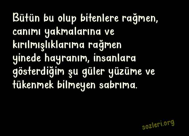 Bütün bu olup bitenlere rağmen, canımı yakmalarına ve kırılmışlıklarıma rağmen yinede hayranım, insanlara gösterdiğim şu güler yüzüme ve tükenmek bilmeyen sabrıma. ( Tükenmek )