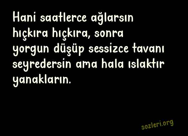 Hani saatlerce ağlarsın hıçkıra hıçkıra, sonra yorgun düşüp sessizce tavanı seyredersin ama hala ıslaktır yanakların. ( Tükenmek )