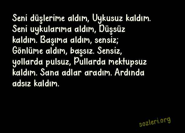Seni düşlerime aldım, Uykusuz kaldım. Seni uykularıma aldım, Düşsüz kaldım. Başıma aldım, sensiz; Gönlüme aldım, başsız. Sensiz, yollarda pulsuz, Pullarda mektupsuz kaldım. Sana adlar aradım. Ardında adsız kaldım. ( Tükenmek )
