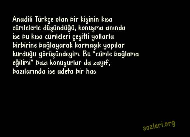 Anadili Türkçe olan bir kişinin kısa cümlelerle düşündüğü, konuşma anında ise bu kısa cümleleri çeşitli yollarla birbirine bağlayarak karmaşık yapılar kurduğu görüşündeyim. Bu “cümle bağlama eğilimi” bazı konuşurlar da zayıf, bazılarında ise adeta bir has ( Türkçe )