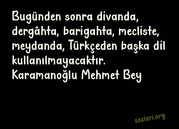 Bugünden sonra divanda, dergâhta, barigahta, mecliste, meydanda, Türkçeden başka dil kullanılmayacaktır. Karamanoğlu Mehmet Bey ( Türkçe )