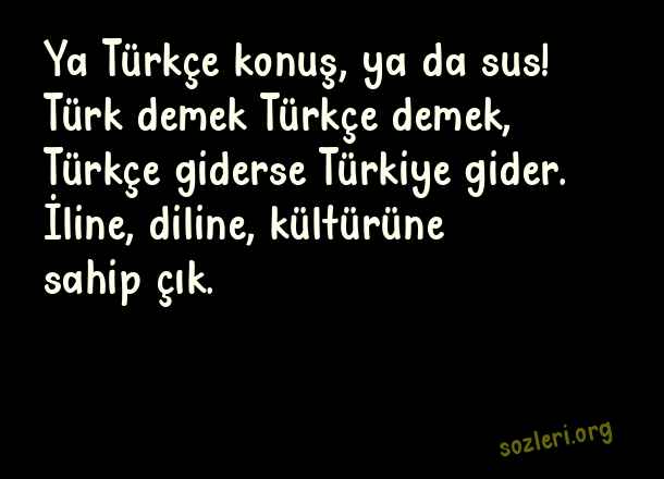Ya Türkçe konuş, ya da sus! Türk demek Türkçe demek, Türkçe giderse Türkiye gider. İline, diline, kültürüne sahip çık. ( Türkçe )