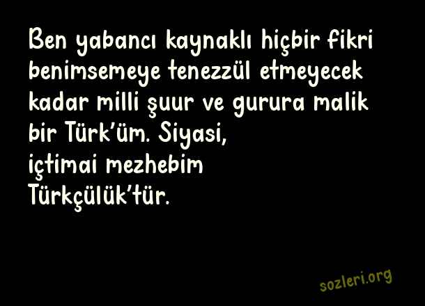 Ben yabancı kaynaklı hiçbir fikri benimsemeye tenezzül etmeyecek kadar milli şuur ve gurura malik bir Türk’üm. Siyasi, içtimai mezhebim Türkçülük’tür. ( Türkçü Sözler )