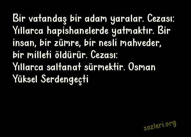 Bir vatandaş bir adam yaralar. Cezası: Yıllarca hapishanelerde yatmaktır. Bir insan, bir zümre, bir nesli mahveder, bir milleti öldürür. Cezası: Yıllarca saltanat sürmektir. Osman Yüksel Serdengeçti ( Türkçü Sözler )