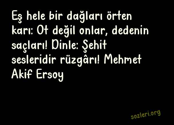 Eş hele bir dağları örten karı: Ot değil onlar, dedenin saçları! Dinle: Şehit sesleridir rüzgârı! Mehmet Akif Ersoy ( Türkçü Sözler )