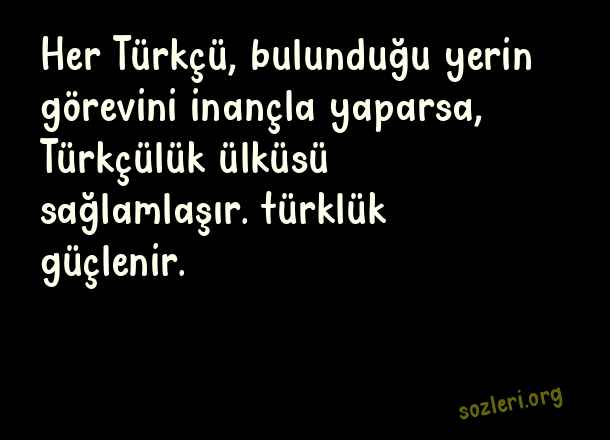 Her Türkçü, bulunduğu yerin görevini inançla yaparsa, Türkçülük ülküsü sağlamlaşır. türklük güçlenir. ( Türkçü Sözler )