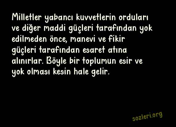 Milletler yabancı kuvvetlerin orduları ve diğer maddi güçleri tarafından yok edilmeden önce, manevi ve fikir güçleri tarafından esaret atına alınırlar. Böyle bir toplumun esir ve yok olması kesin hale gelir. ( Türkçü Sözler )
